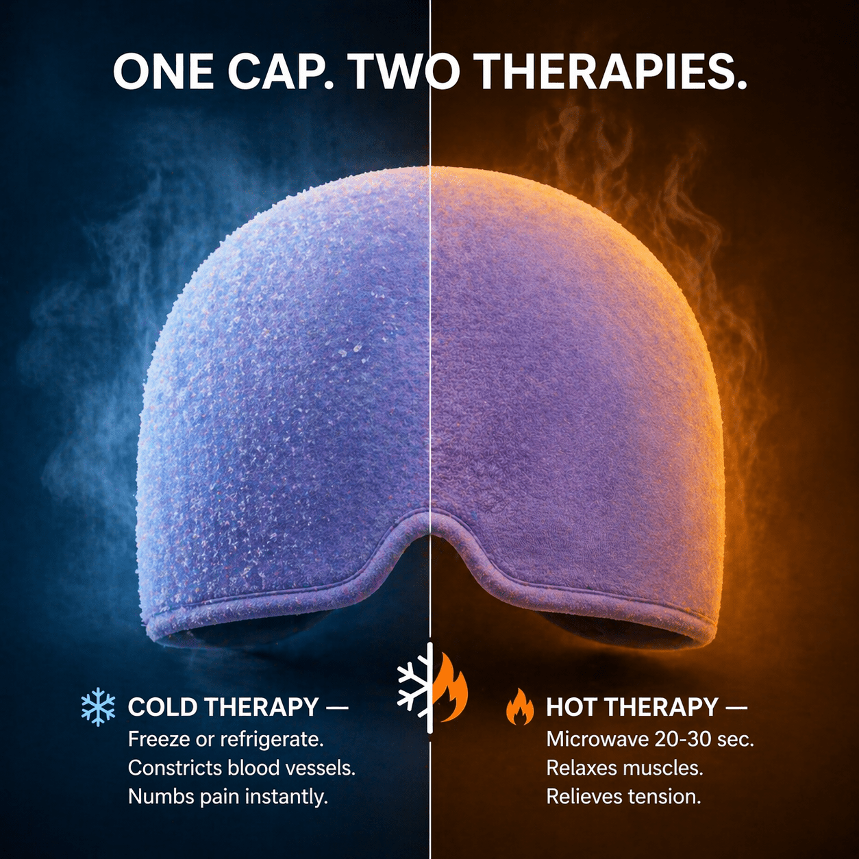 Targeted cold constricts dilated vessels in the scalp, easing the throbbing pressure of migraine and tension headaches at the source.